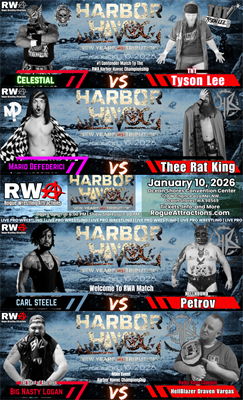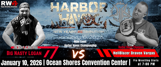 This event brings together some of the most intense rivalries and biggest matchups in Rogue Wrestling Attractions, headlined by a long-awaited Harbor Havoc Championship Match. Reigning Harbor Havoc champion “HellBlazer” Draven Vargas defends his title against Big Nasty Logan, “The Beast of Aberdeen,” in a showdown more than a year in the making. Their rivalry has been fueled by controversy, physical punishment, and unfinished business, and now it comes to a head with the championship on the line.